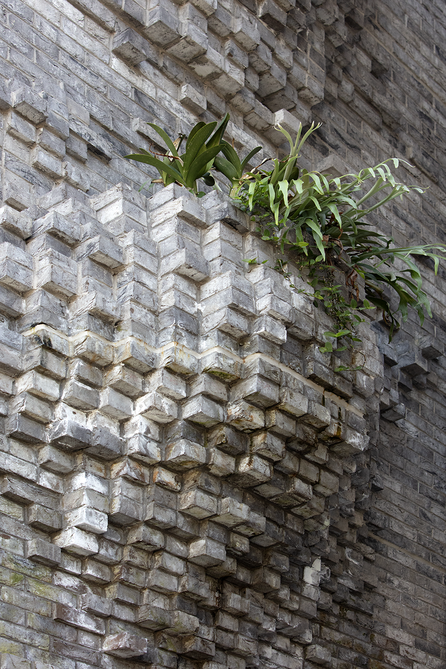 Assemblage 2024, installed at 163-173 McEvoy Street, reconstructs and amplifies this natural process. A series of brick fragments emerge from the building’s façade, simultaneously appearing as part of and distinct from the architecture. Natural lighting accentuates the geometric reliefs, while in certain areas, the structured forms dissolve into pockets of native lithophytes. Over time, moss and other spontaneous growth will further integrate the work into its surroundings, blurring the boundary between the built and organic.