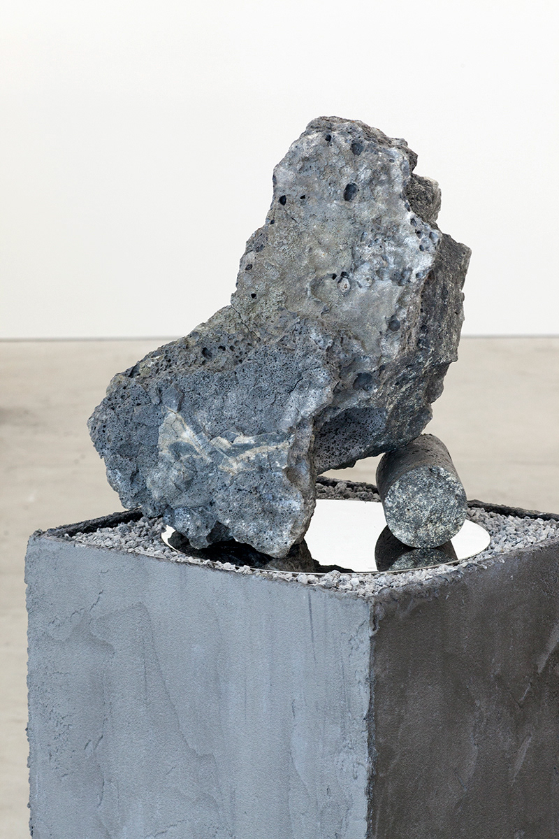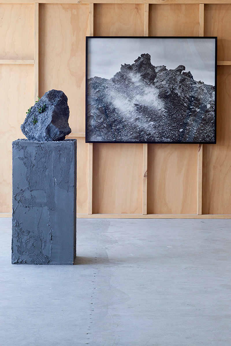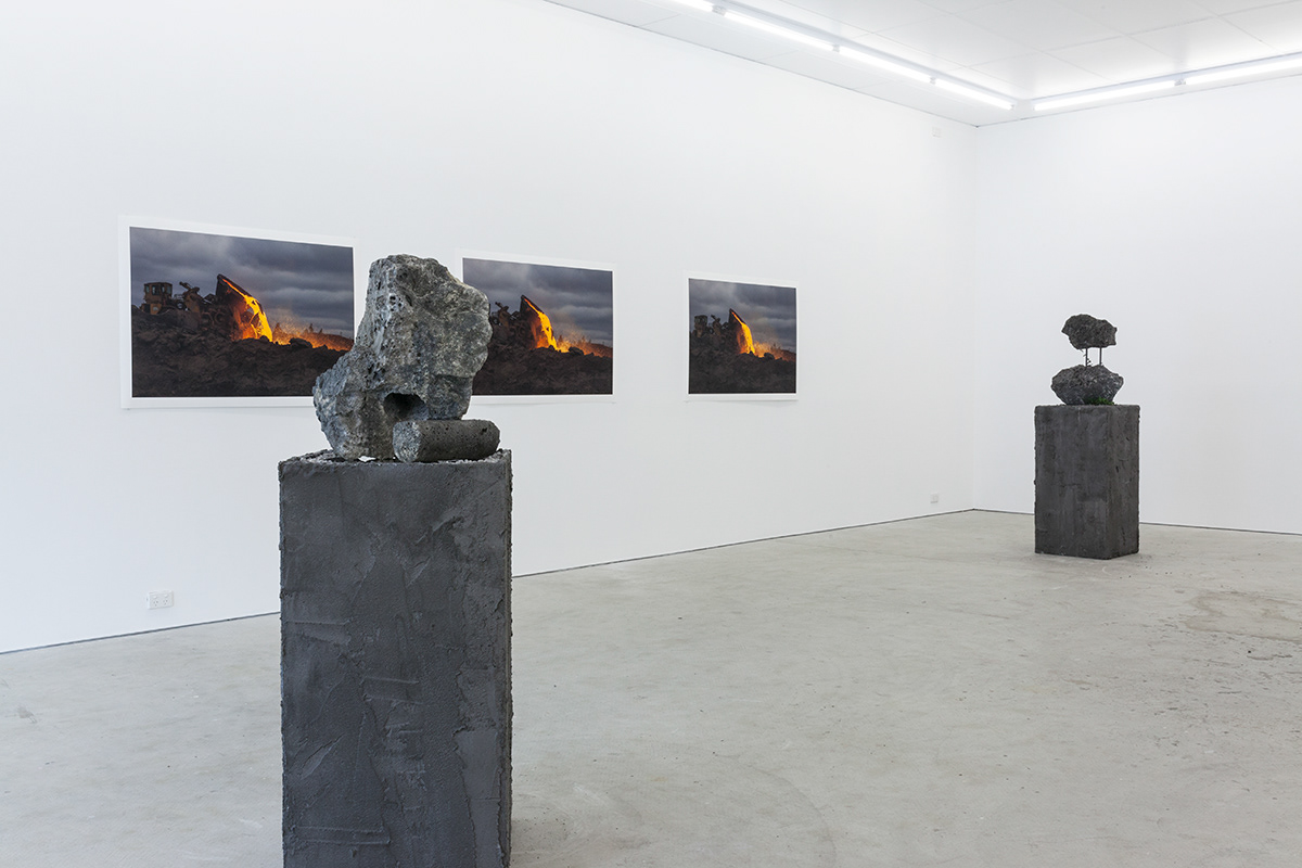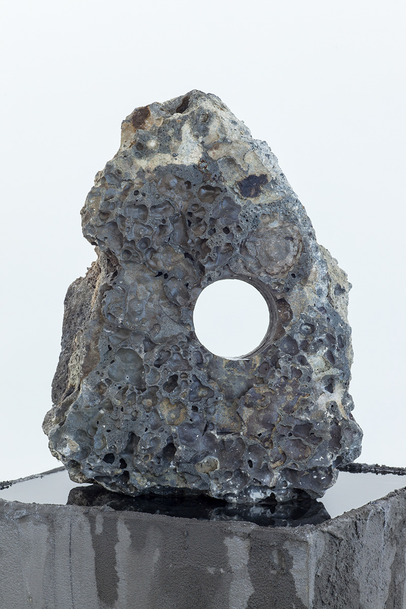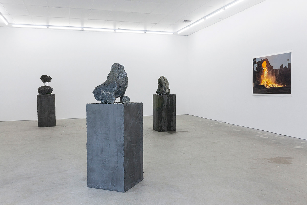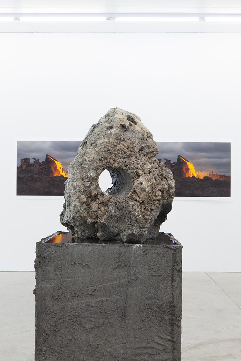 Working with arcane methods of mineral and resource extraction, Jamie North has gained critical attention for his ruinous appearing sculptures made from hand-produced concrete. Treating a traditionally mass-produced process with artisanal care, North creates formal structures that appear to have been weathered and deteriorated by the elements, while fostering and supporting emerging plant-life. Slag Studies begins to unpack the modes of production for which the artist is renowned. In a suite of photographic works, North depicts the industrial process of extracting iron, rendered moodily dark and foreboding, with machinery moving to tip molten slag into a churned landscape. In each, the slag pot appears as a fierce and luminous embodiment of energy, not dissimilar to the sun. This circular motif echoes throughout the sculptural works through the coring of slag rocks resulting in cylindrical tunnels. Some of these are filled with water, while in others lithophytes nestle in the cavities, bringing the carboniferous process full cycle. Each sculpture alludes to the various studio processes the artist employs in the making of his sculptural work, with the slag that has been used primarily as a material component in previous works essentialised and taking centre stage.