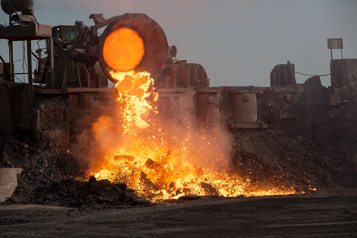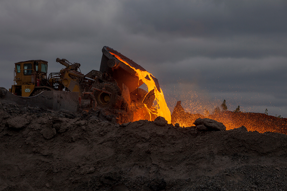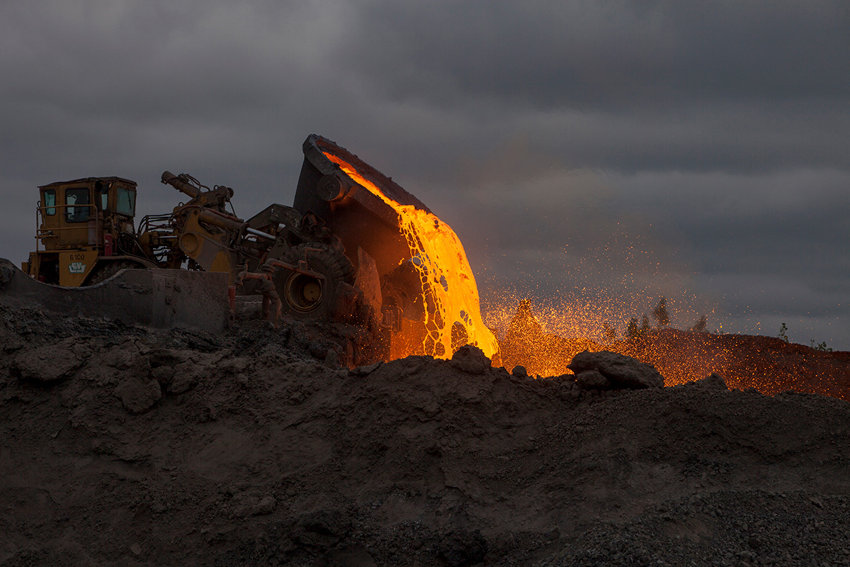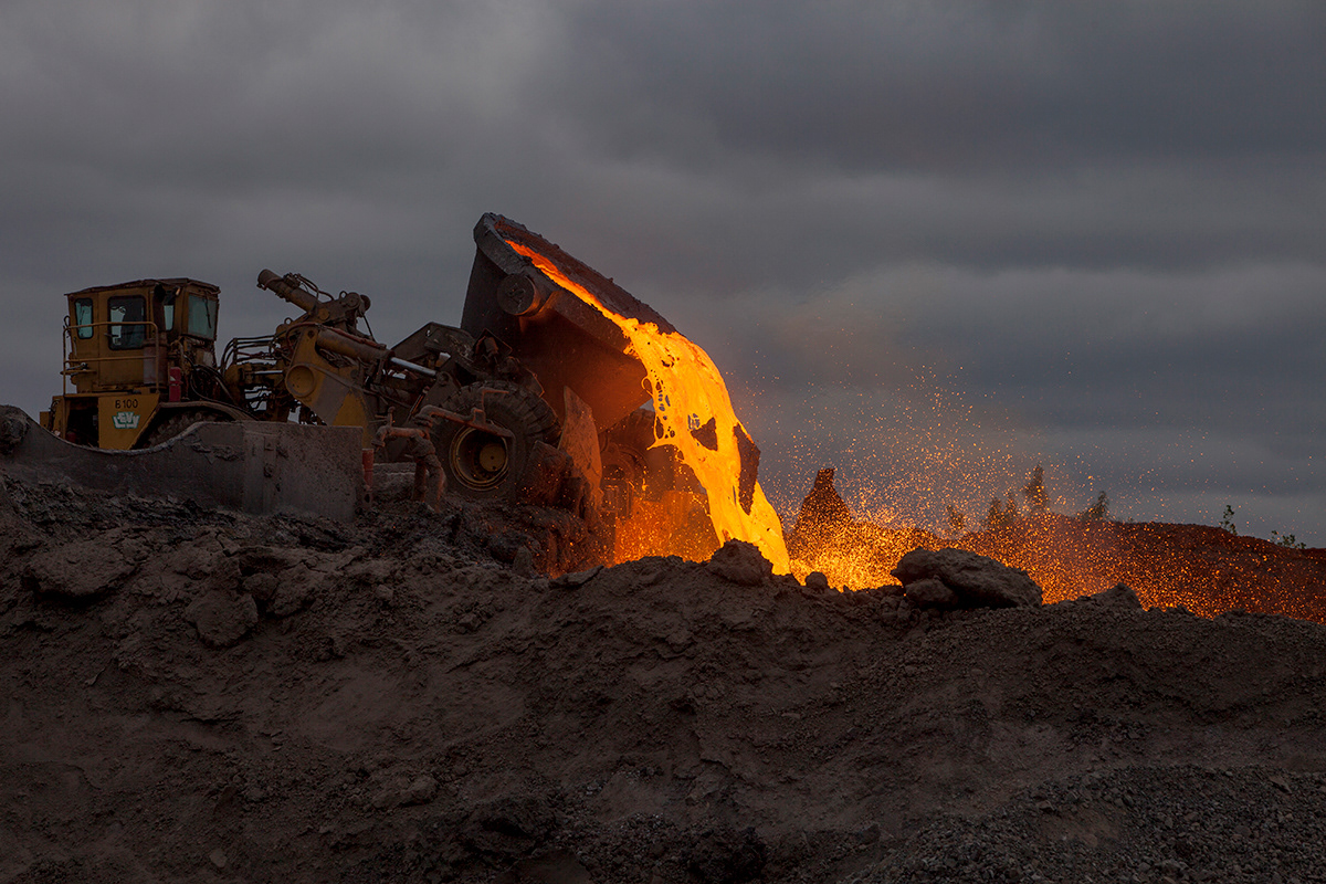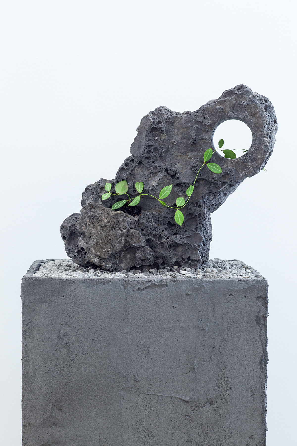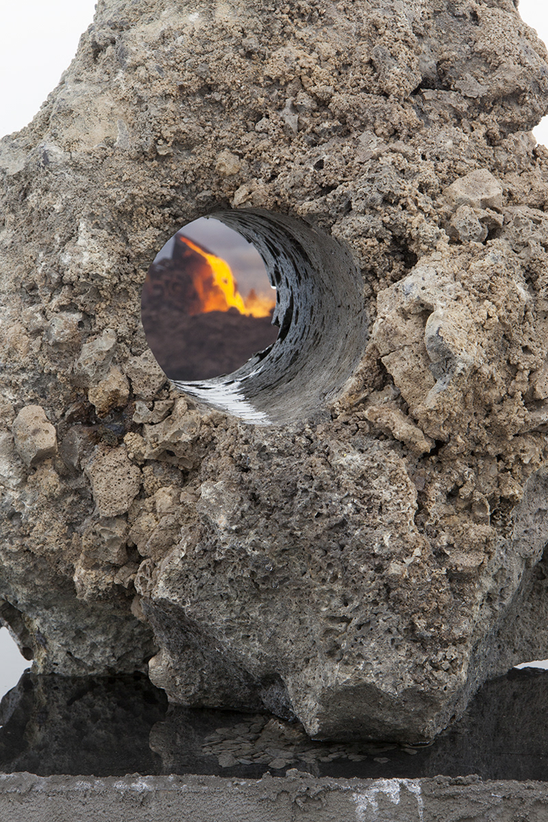 Working with arcane methods of mineral and resource extraction, Jamie North has gained critical attention for his ruinous appearing sculptures made from hand-produced concrete. Treating a traditionally mass-produced process with artisanal care, North creates formal structures that appear to have been weathered and deteriorated by the elements, while fostering and supporting emerging plant-life. Slag Studies begins to unpack the modes of production for which the artist is renowned. In a suite of photographic works, North depicts the industrial process of extracting iron, rendered moodily dark and foreboding, with machinery moving to tip molten slag into a churned landscape. In each, the slag pot appears as a fierce and luminous embodiment of energy, not dissimilar to the sun. This circular motif echoes throughout the sculptural works through the coring of slag rocks resulting in cylindrical tunnels. Some of these are filled with water, while in others lithophytes nestle in the cavities, bringing the carboniferous process full cycle. Each sculpture alludes to the various studio processes the artist employs in the making of his sculptural work, with the slag that has been used primarily as a material component in previous works essentialised and taking centre stage.